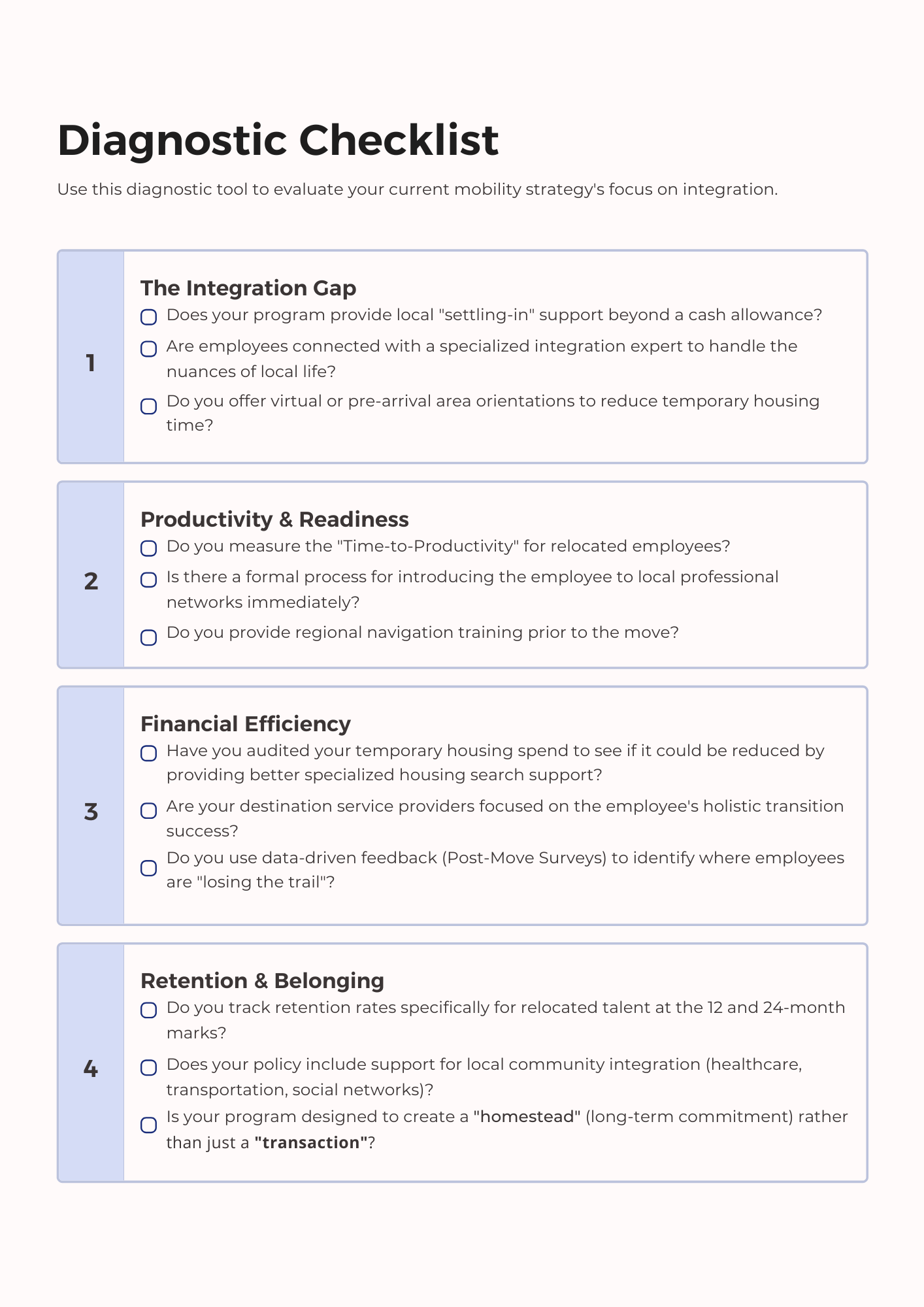 Evaluate your Mobility Strategy Use this diagnostic tool to evaluate your current mobility strategy's focus on integration. Download Checklist